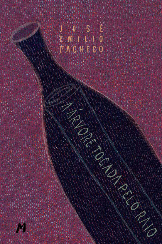 Desenho de uma garrafa escura inclinada com textos e fundo púrpura