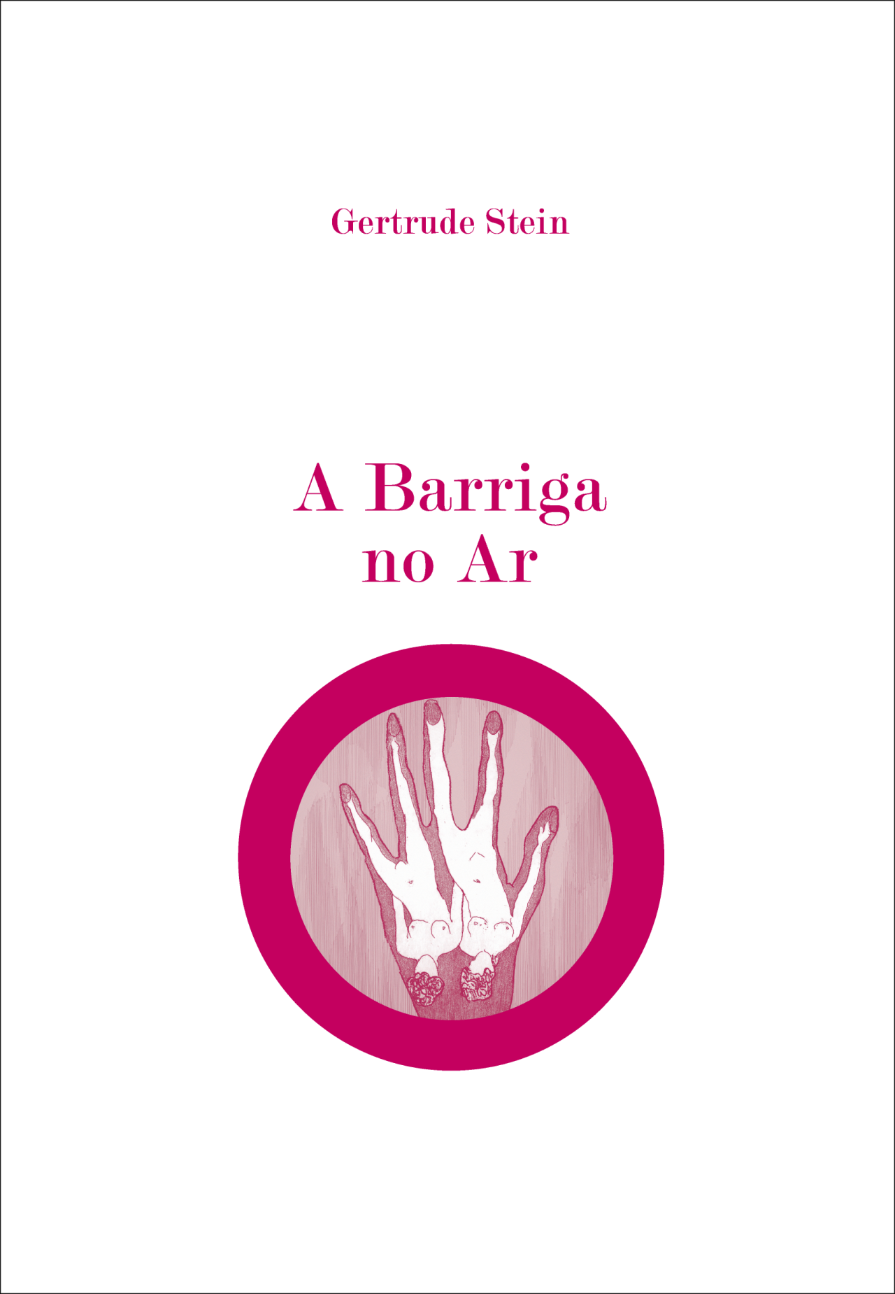 • Capa de livro branca com título e autor em rosa e uma ilustração de mão em círculo cor-de-rosa