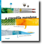 • Capa do livro infantil 'A Crocodila Mandona' com ilustrações de crocodilo colorido.