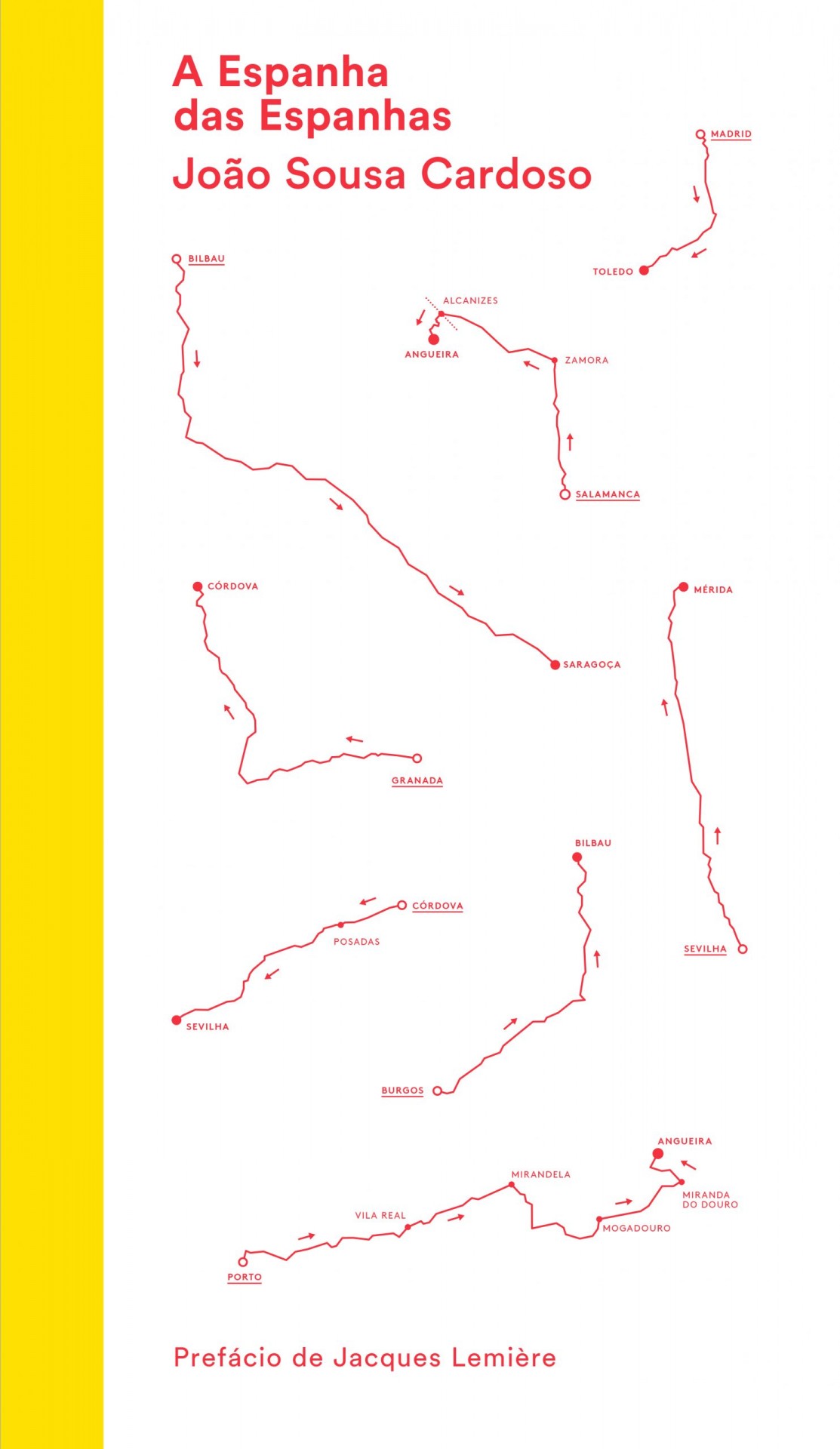 • Capa de livro branca com faixa amarela e textos vermelhos, mapas estilizados de cidades espanholas e portuguesas.