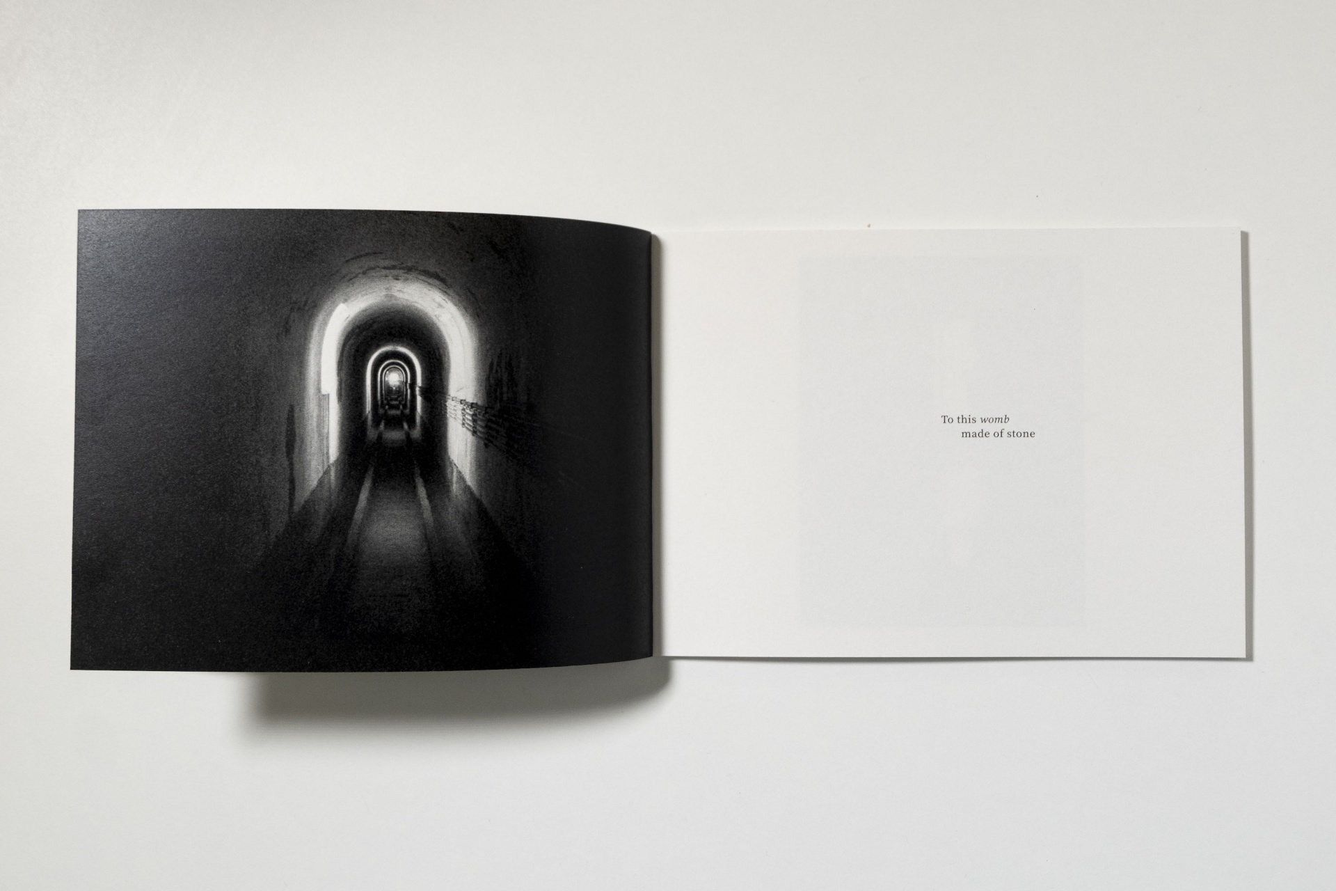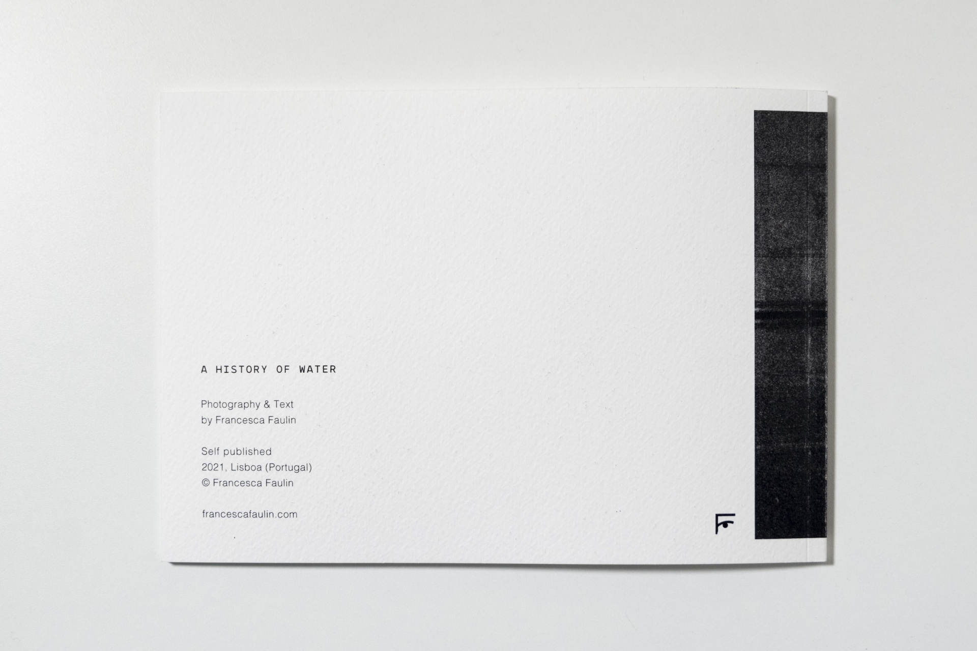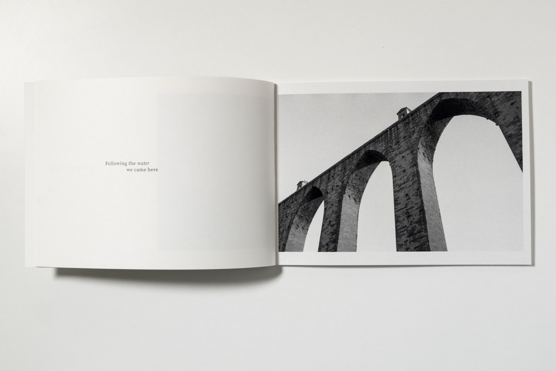 It all started with a vision of water flooding the streets. Back in February 2019, I took a photography course to learn the art of developing and enlarging. A group exhibition was due later in March, the topic being Lisbon, and I was searching for an angle, avoiding cliches. As things often come together, the vision, followed by a conversation with a stranger about Lisbon’s water tunnels, brought me to discover the Reservatório da Mãe d'Água and the Aqueduto das Águas Livres. In the darkroom, working on the two rolls shot in these locations, that vision of water came back: water as a metaphor for creative force. A story about meeting our daemon, that part of us that fuels creative work through inspiration. At the same time, the images tell the story of the city of Lisbon through the places that were once central to life, now distant memories, reflections in a dark pool. I wanted to give this work a material form, bringing words and images together for a more intimate reading.
