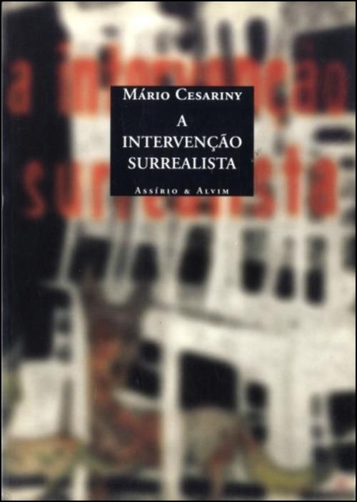 • Capa do livro 'A Intervenção Surrealista' de Mário Cesariny com texto branco em fundo preto e fundo desfocado em cinza e vermelho