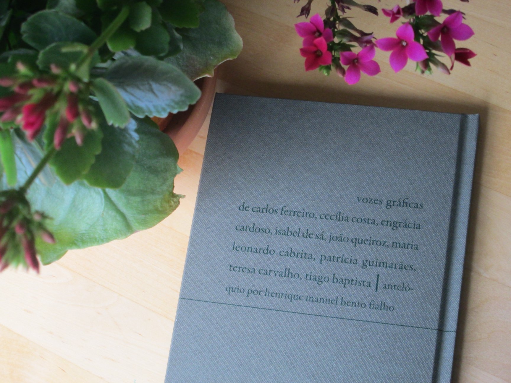 Livro com capa cinzenta dura ao lado de planta com flores cor-de-rosa num vaso de barro