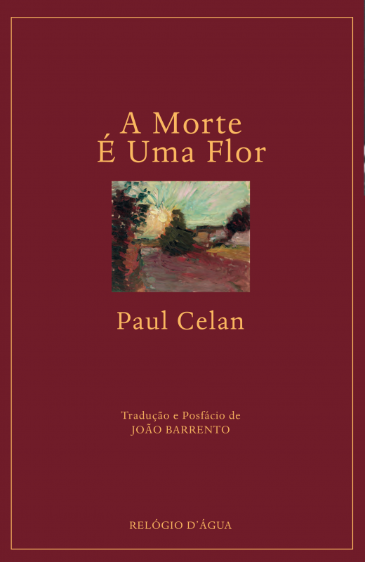 • Capa de livro 'A Morte É Uma Flor' de Paul Celan em fundo borgonha