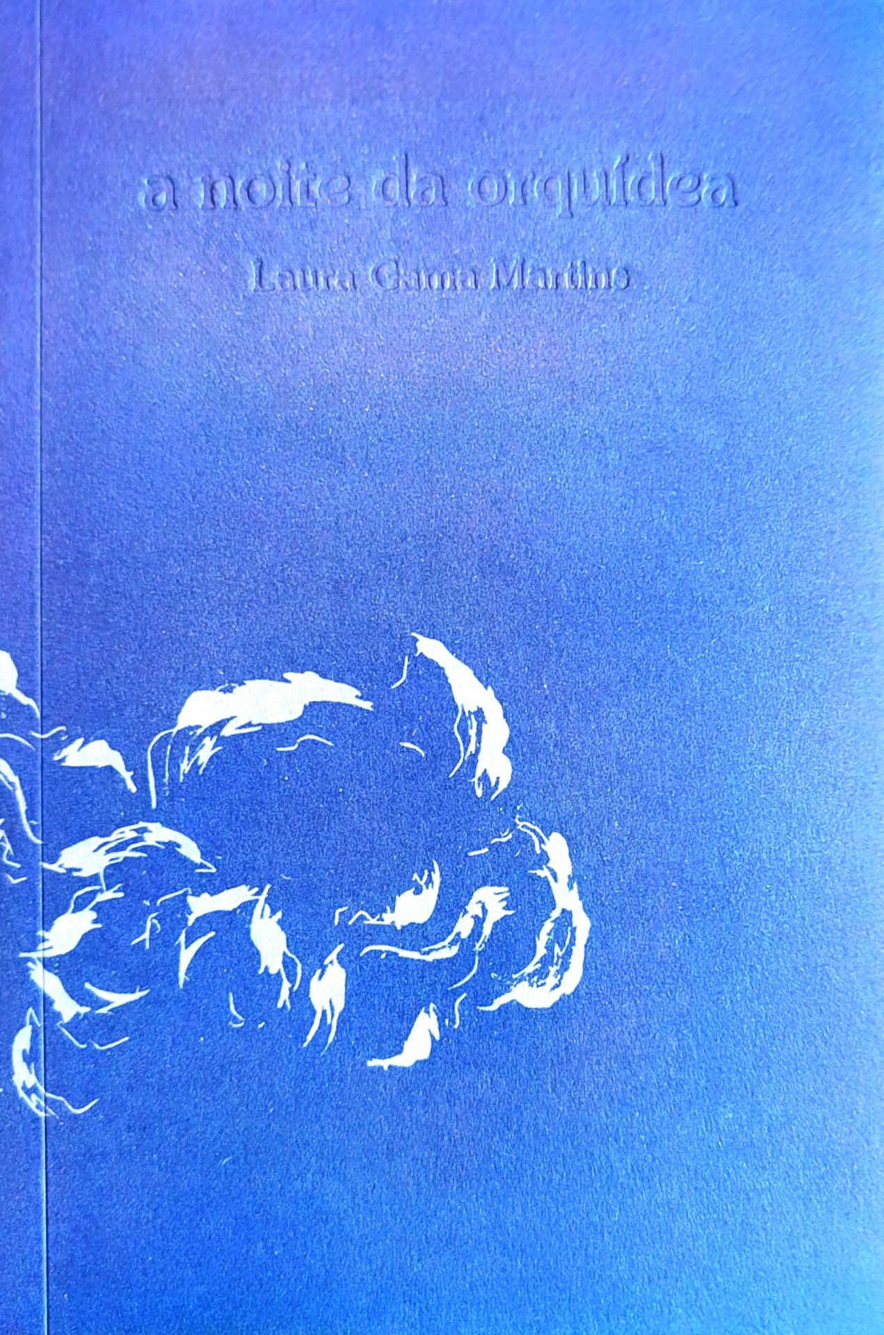 • Capa azul de livro com desenho branco de orquídea e texto em relevo.