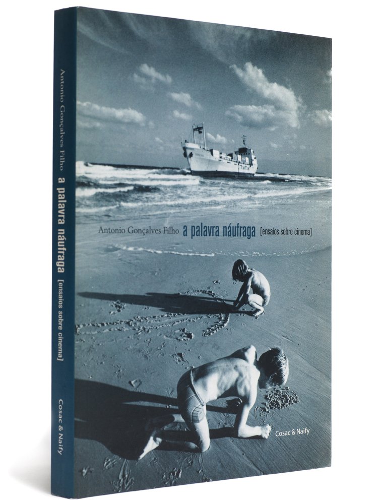 • Capa do livro 'a palavra náufraga [ensaios sobre cinema]' com imagem de crianças na praia e navio encalhado.