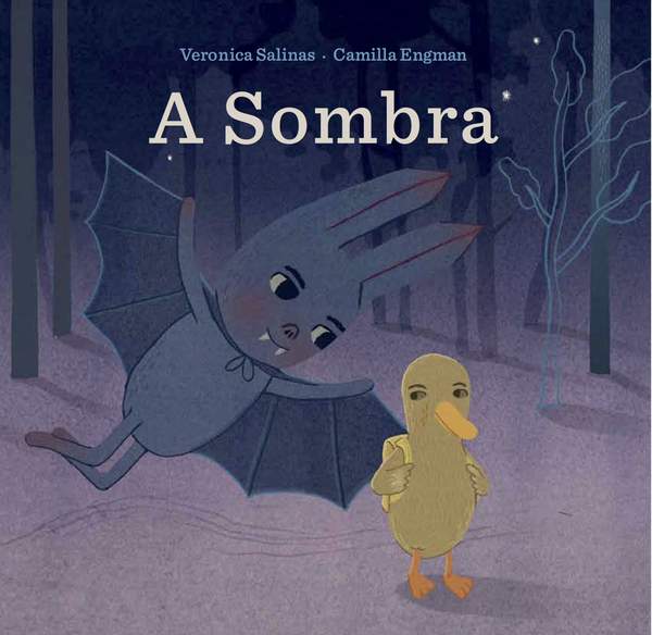 • Capa de livro infantil com morcego e pato em floresta escura e o título A Sombra