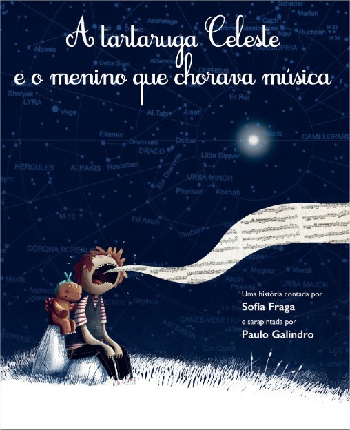 Capa de livro infantil com título, criança a vomitar notas musicais sob o céu estrelado