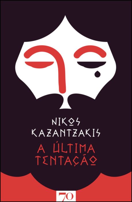 • Capa do livro A Última Tentação de Nikos Kazantzakis com rosto estilizado e texto em vermelho e branco