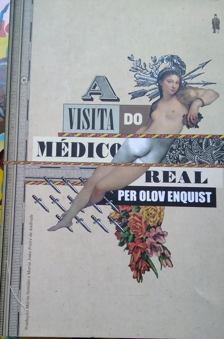 • Capa de livro com ilustração de mulher nua com capacete e flechas, texto 'A VISITA DO MÉDICO REAL'.