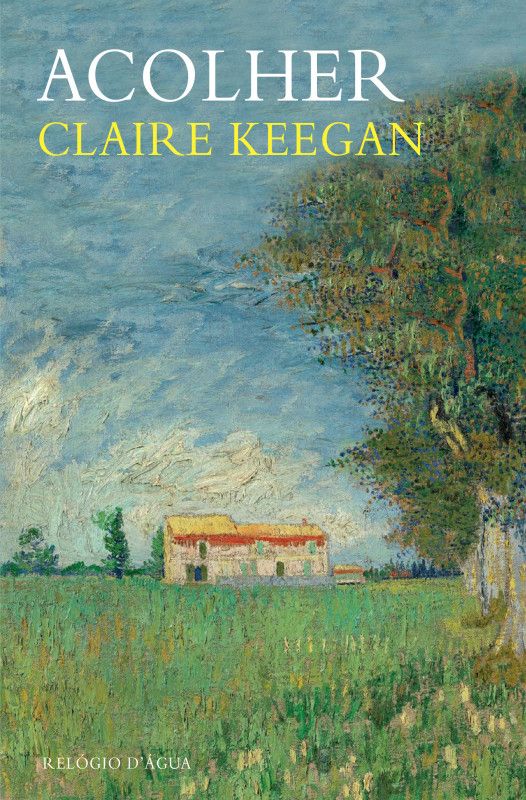 • Capa do livro ACOLHER de Claire Keegan com pintura de casa em campo e céu azul.