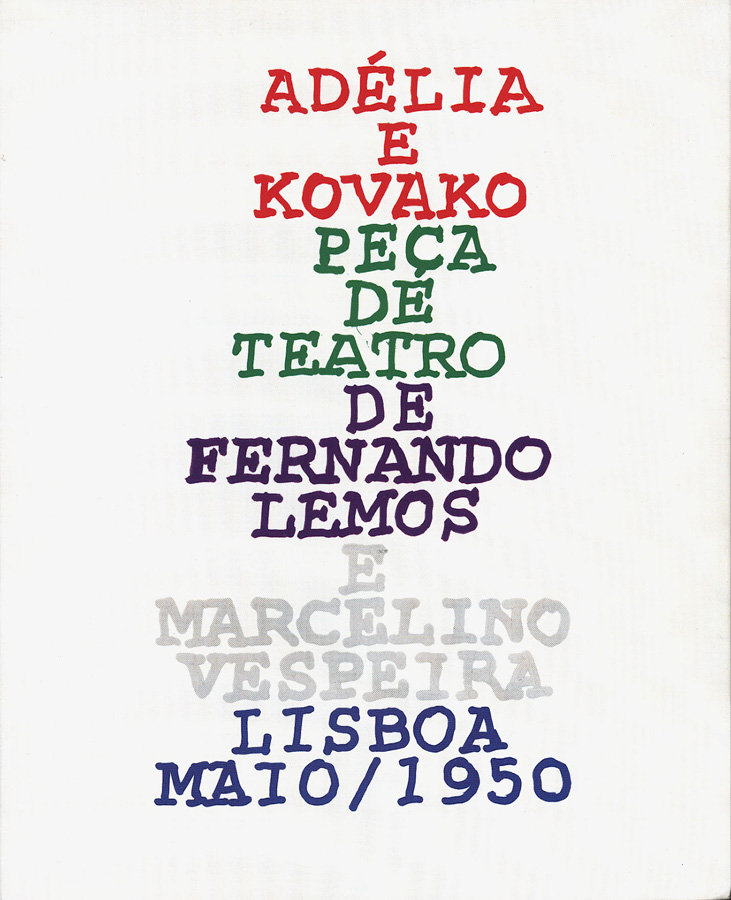 Folha branca com texto colorido anunciando uma peça de teatro de Fernando Lemos e Marcelino Vespeira em Lisboa, maio de 1950.