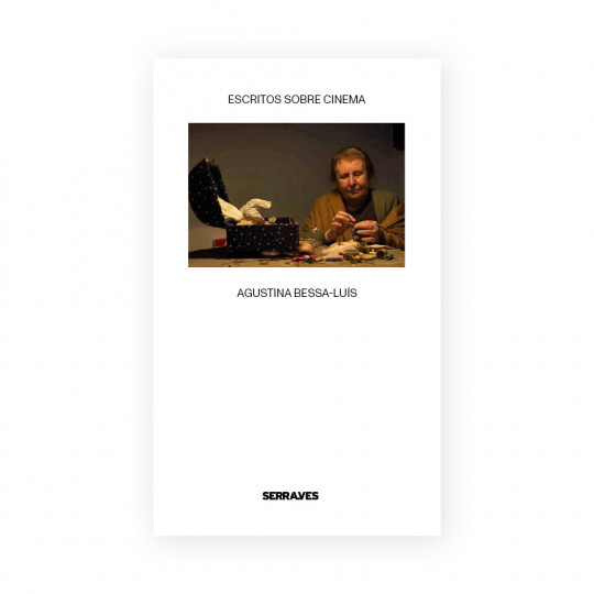 Capa branca de livro com imagem de homem à mesa e textos ESCRITOS SOBRE CINEMA, AGUSTINA BESSA-LUÍS e SERRAVES