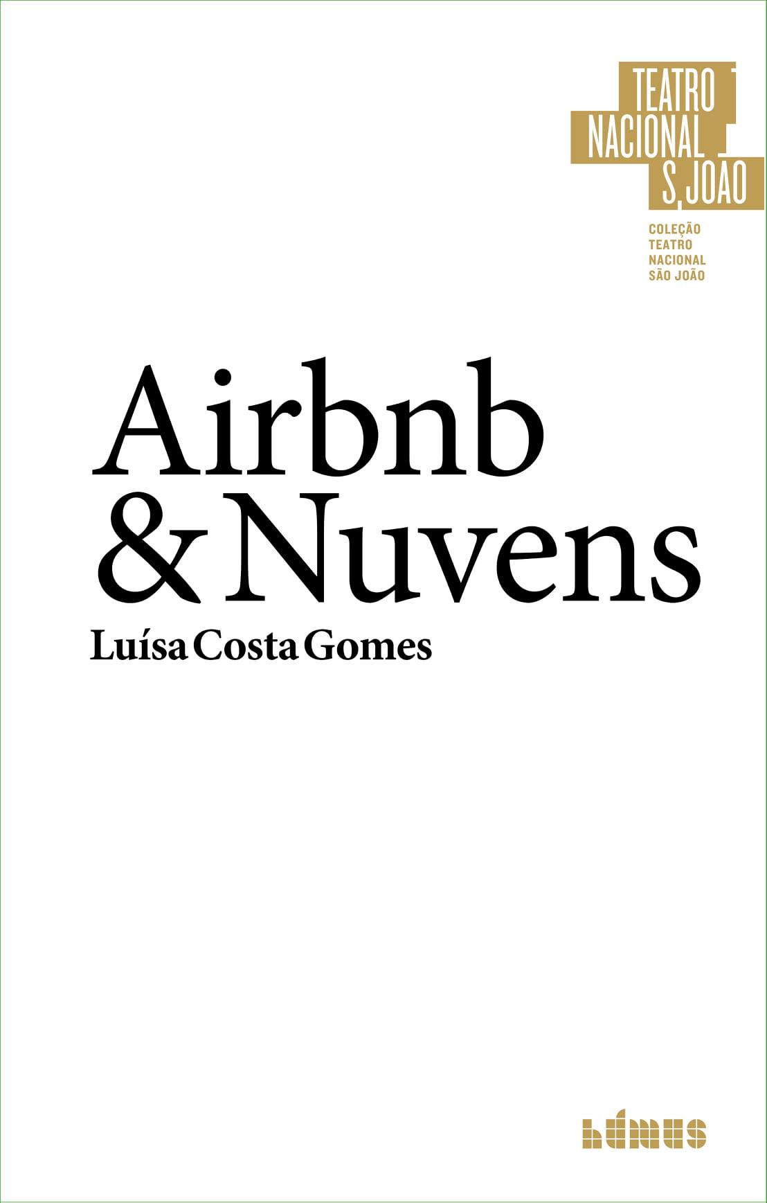 • Capa de peça de teatro 'Airbnb & Nuvens' com texto em branco, preto e dourado.