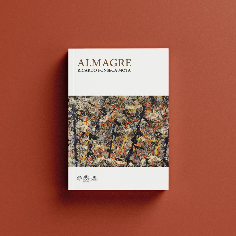 • Capa de livro branca com título ALMAGRE e faixa artística colorida central