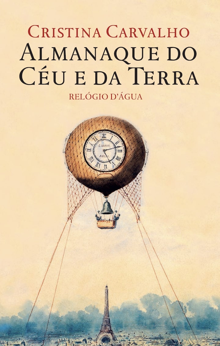 • Capa de livro com balão-relógio, título Almanaque do Céu e da Terra e Torre Eiffel ao fundo