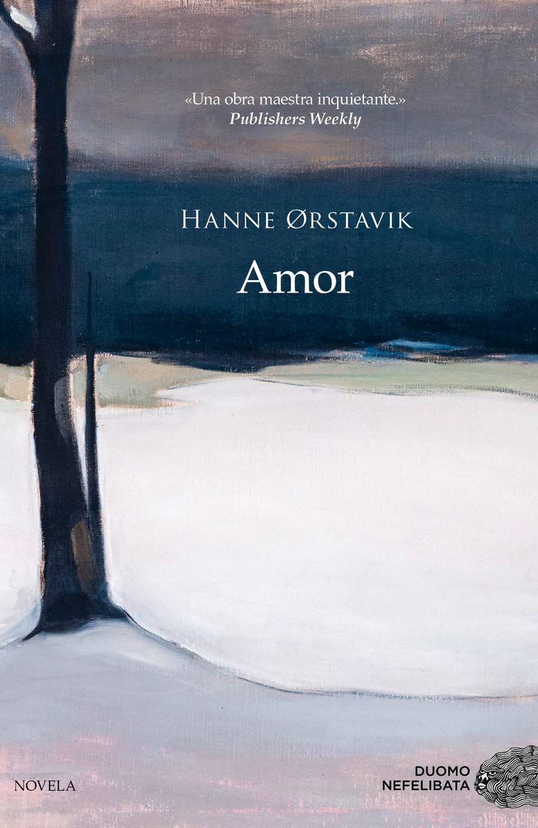 Capa de livro Amor de Hanne Ørstavik com ilustração de árvore e neve