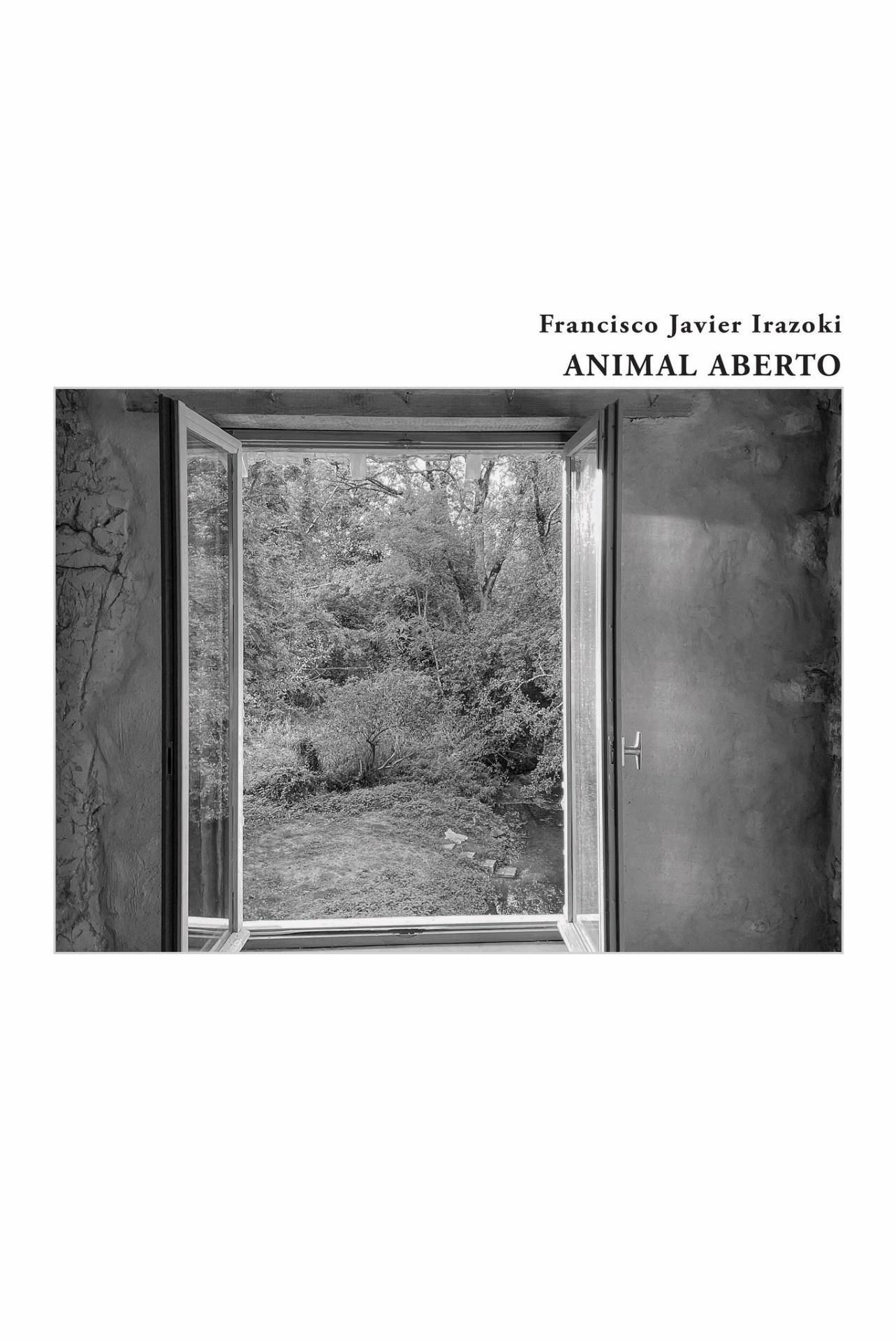 • Capa de livro com fotografia de janela aberta para jardim e texto 'Francisco Javier Irazoki ANIMAL ABERTO'