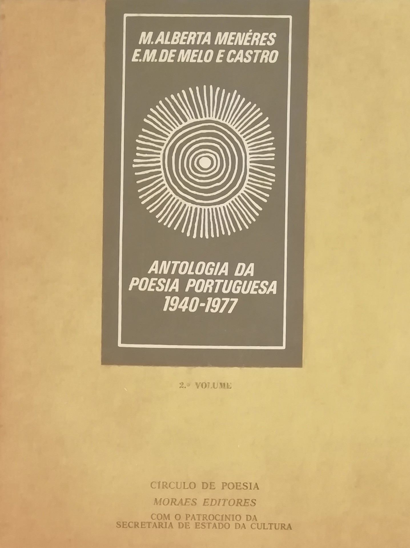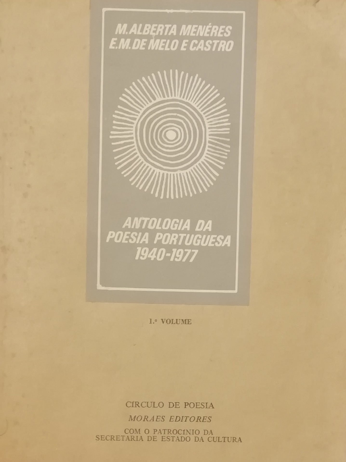 Antologia da Poesia Portuguesa 1940-1977 (2 volumes) 79,71 € Desconto de %. IVA incluído. Partilhar Comprar Contactar Antologia da Poesia Portuguesa 1940-1977 (2 volumes) organizada por M. Alberta Menéres e E. M. de Melo e Castro Círculo de Poesia, Moraes Editores Lisboa, 1979