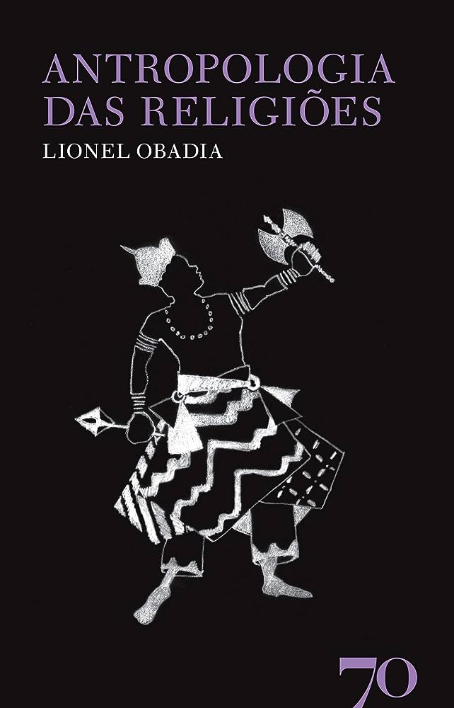 • Capa preta de livro 'Antropologia das Religiões' com figura humana em branco e texto lilás