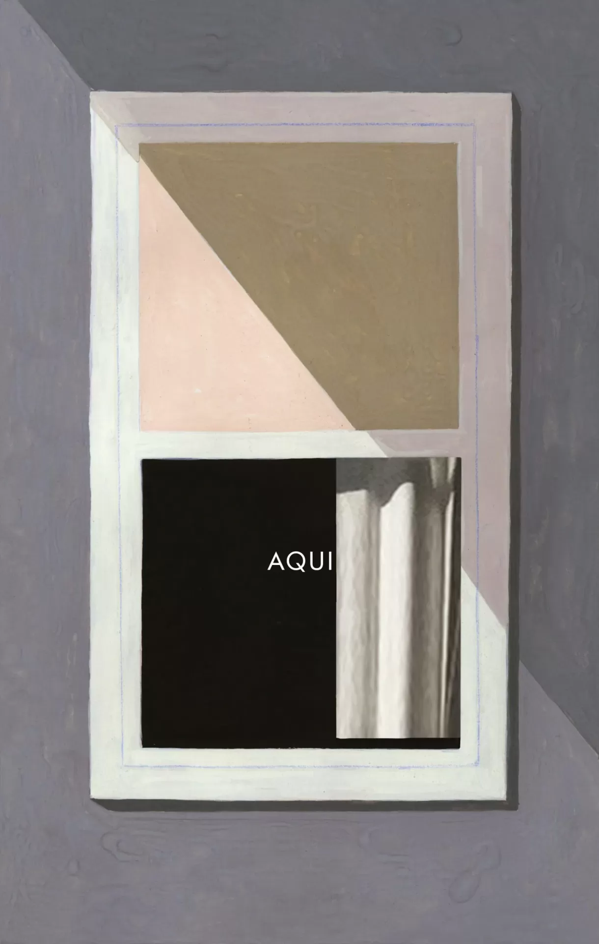 • Janela branca com vidro dividido e palavra 'AQUI' visível no painel inferior