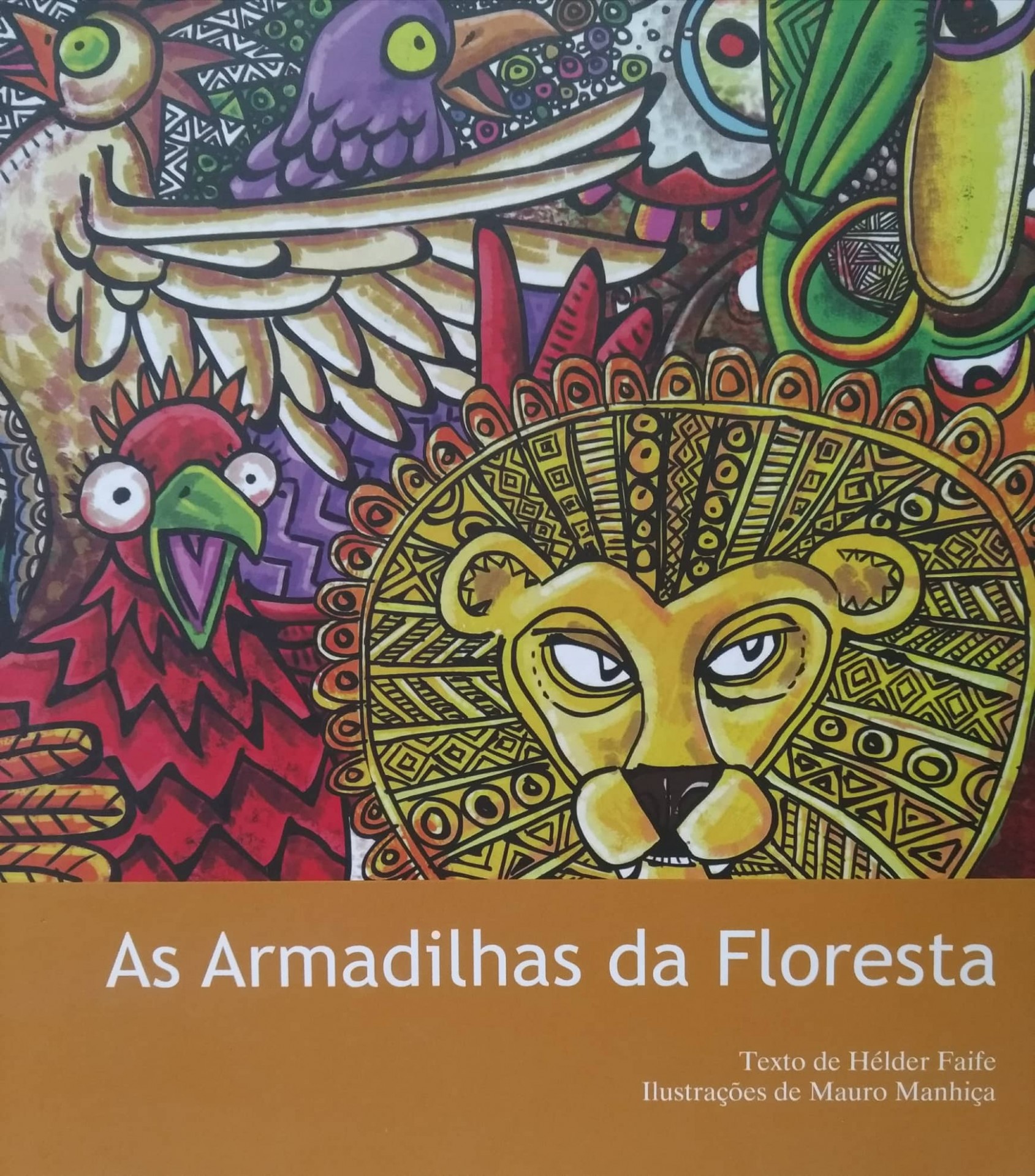 Capa de livro ilustrada com animais e texto do título em faixa castanha