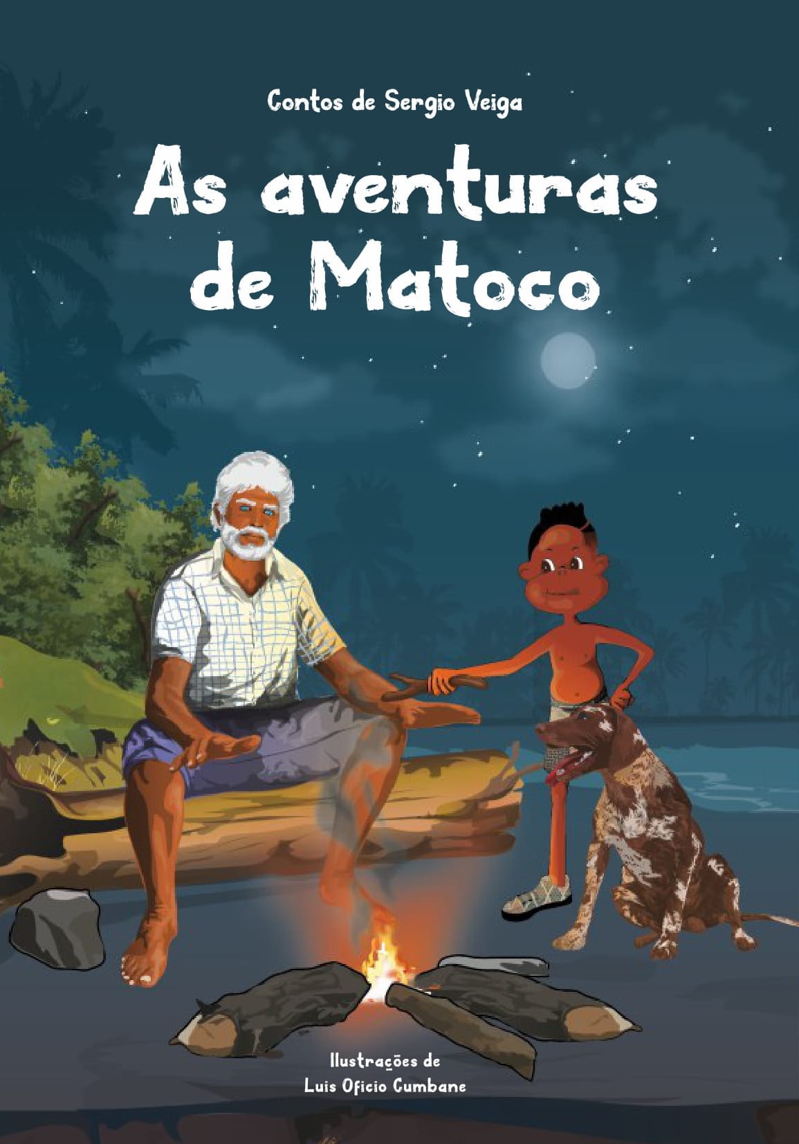 • Capa de livro com homem, rapaz e cão junto a fogo de campismo à noite