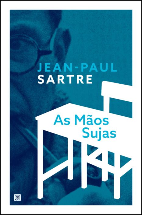• Capa do livro 'As Mãos Sujas' de Jean-Paul Sartre com fundo azul e figura de mesa e cadeira brancas