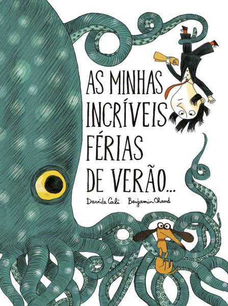 • Capa de livro com polvo, homem e cão em ilustração, e texto em português.