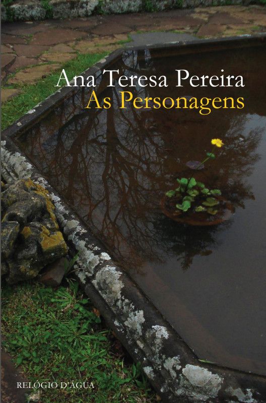 • Capa do livro 'As Personagens' com fonte clara sobre imagem de bacia de pedra com água e flor amarela