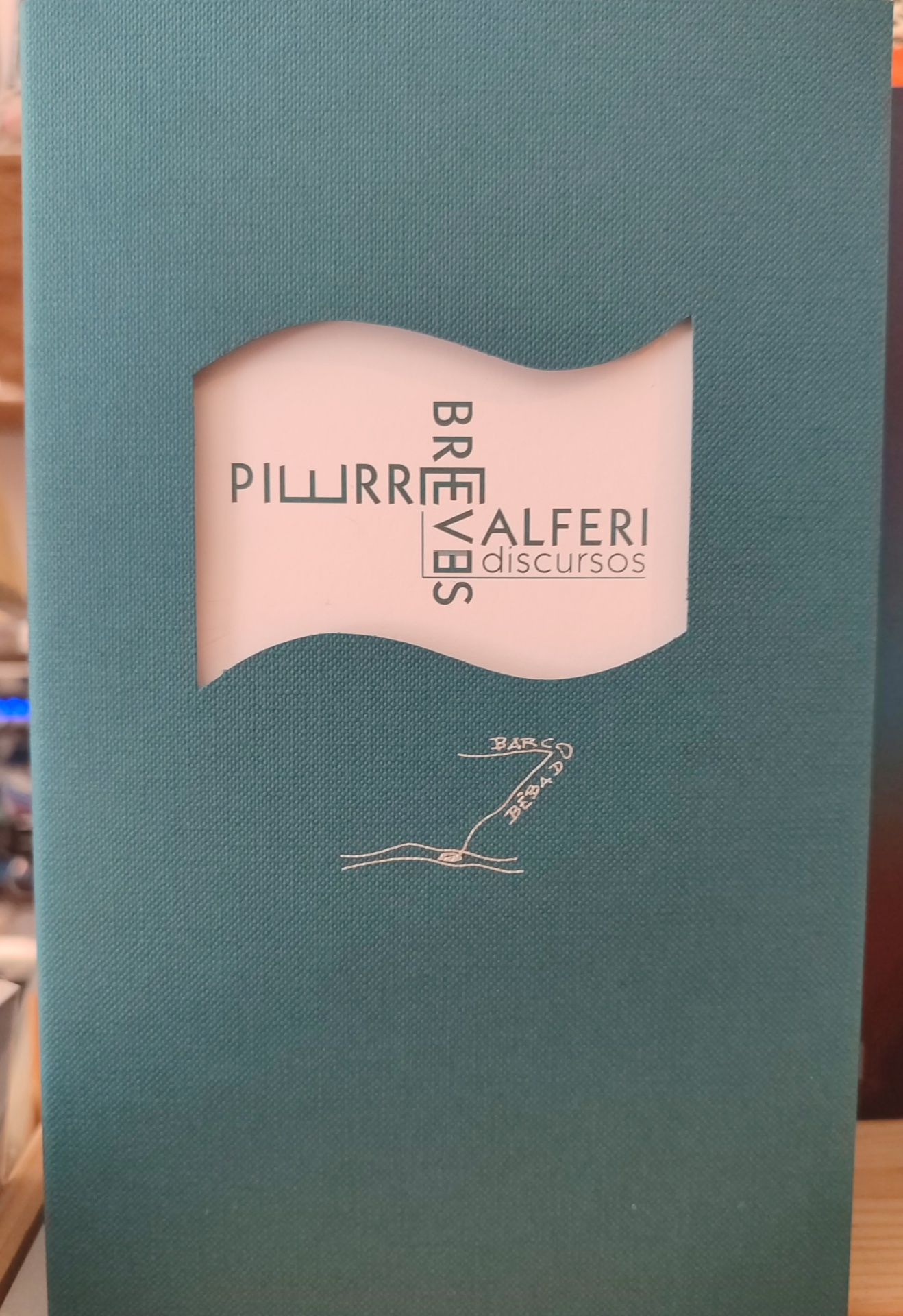 • Livro com capa verde-azulada e recorte ondulado mostrando texto e desenho interno.