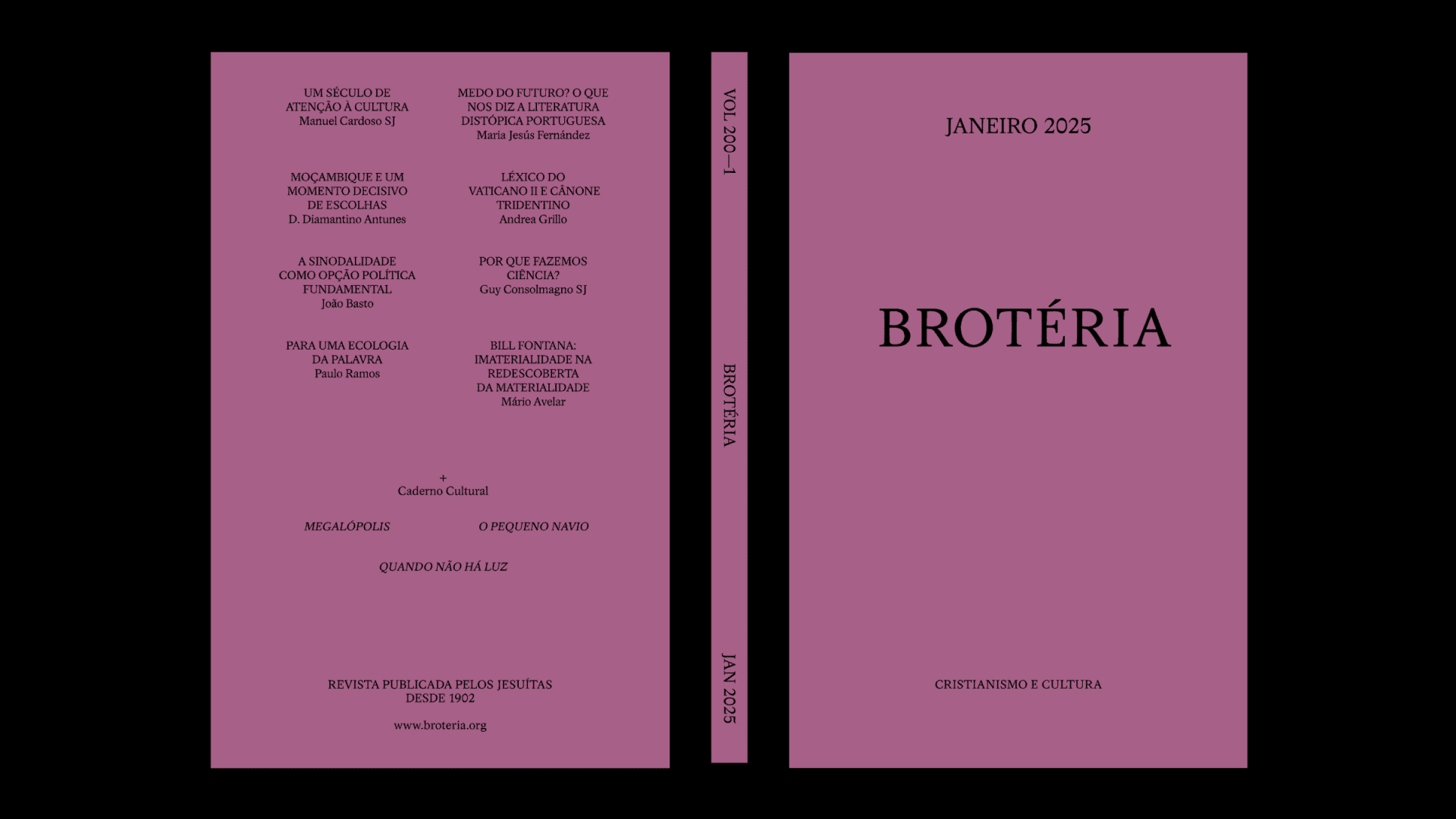 “VOL 200–1”, que se lê na lombada deste número, indica que alcançámos 100 anos de publicação – em cada ano, publicamos dois volumes. Em 1925, a Brotéria “Vulgarização Científica” adotava o subtítulo “Fé, ciências e letras”. A atenção às letras assumia importância crescente ao ponto de motivar, logo em 1932, uma mudança de subtítulo para “Revista contemporânea de cultura”. A evocação desta data não pretende assinalar a publicação de uma revista, mas uma determinada forma de habitar o mundo da cultura. Hoje, do ponto de vista temático, a Brotéria procura situar-se em qualquer bom-lugar onde seja possível promover encontros entre a fé cristã e as inquietações e expressões das culturas contemporâneas; metodologicamente, cultiva uma prática multidisciplinar. Entre as iniciativas para festejar este século de trabalho cultural estará o lançamento, em junho próximo, de uma nova série da revista ainda em laboratório.