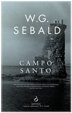 Capa do livro 'Campo Santo' de W.G. Sebald com torre de pedra junto ao mar