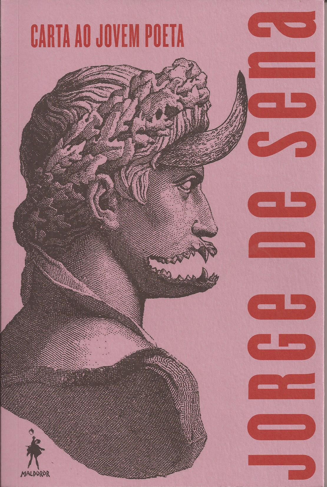 • Capa de livro rosa com retrato em perfil de figura com máscara de animal e texto vermelho Jorge de Sena