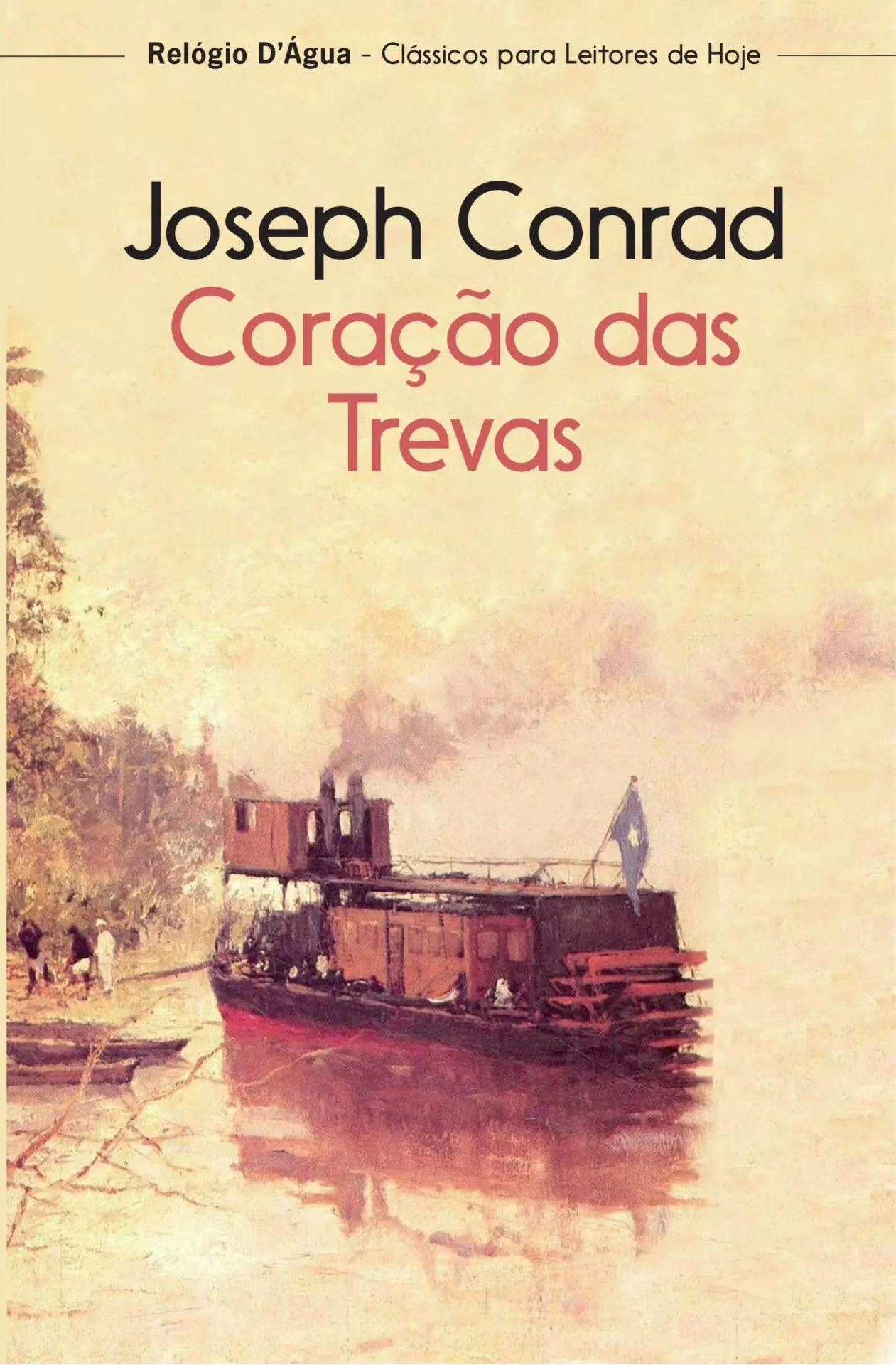 • Capa do livro 'Coração das Trevas' de Joseph Conrad com ilustração de barco a vapor no rio