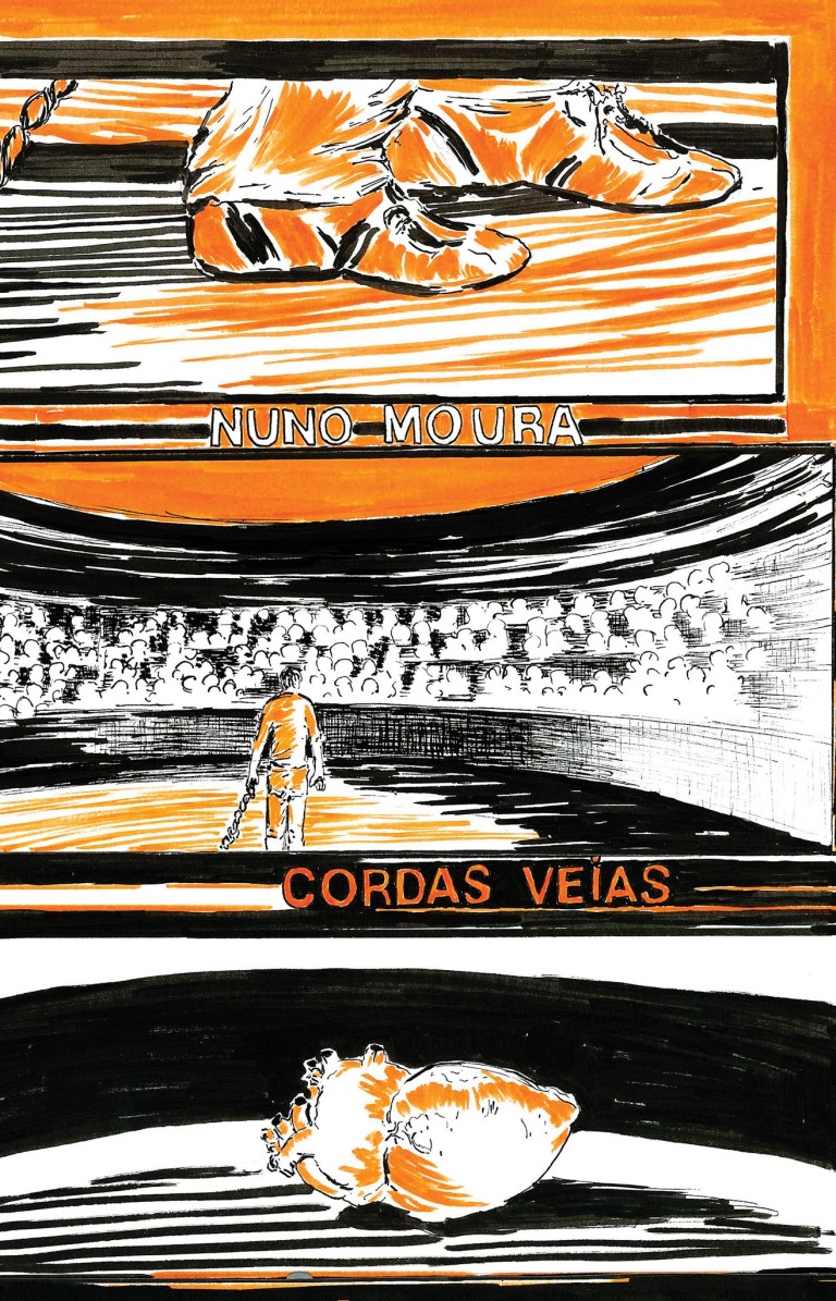 Ilustração em laranja, preto e branco de sapatos de fado, músico num palco e mão segurando palheta, com texto NUNO MOURA e CORDAS VEIAS