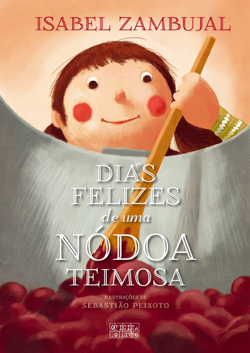 • Capa do livro 'Dias Felizes de uma Nódoa Teimosa' com ilustração de criança usando colher de pau.