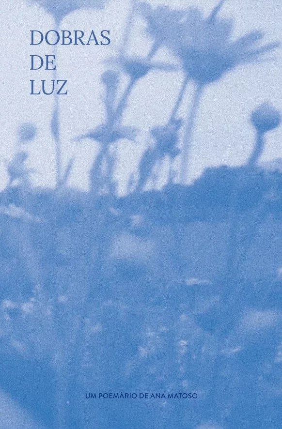 • Capa de livro azul com título Dobras de Luz e fundo de flores desfocadas