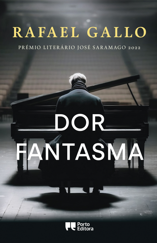 Capa do livro 'Dor Fantasma' com uma pessoa sentada de costas a tocar piano num espaço escuro