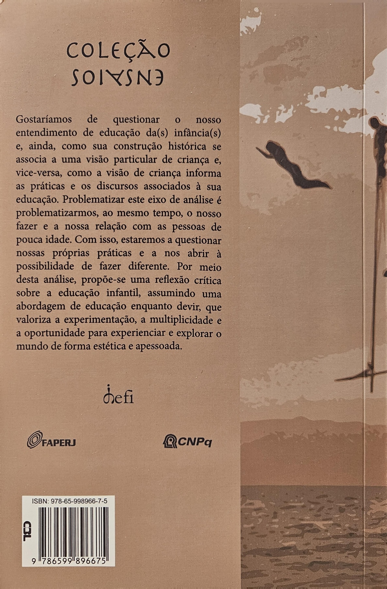 Gostaríamos de questionar o nosso entendimento de educação da(s) infância(s) e, ainda, como sua construção histórica se associa a uma visão particular de criança e, vice-versa, como a visão de criança informa as práticas e os discursos associados à sua educação. Problematizar este eixo de análise é problematizarmos, ao mesmo tempo, o nosso fazer e a nossa relação com as pessoas de pouca idade. Com isso, estaremos a questionar nossas próprias práticas e a nos abrir à possibilidade de fazer diferente. Por meio desta análise, propõe-se uma reflexão crítica sobre a educação infantil, assumindo uma abordagem de educação enquanto devir, que valoriza a experimentação, a multiplicidade e a oportunidade para experienciar e explorar o mundo de forma estética e apessoada.