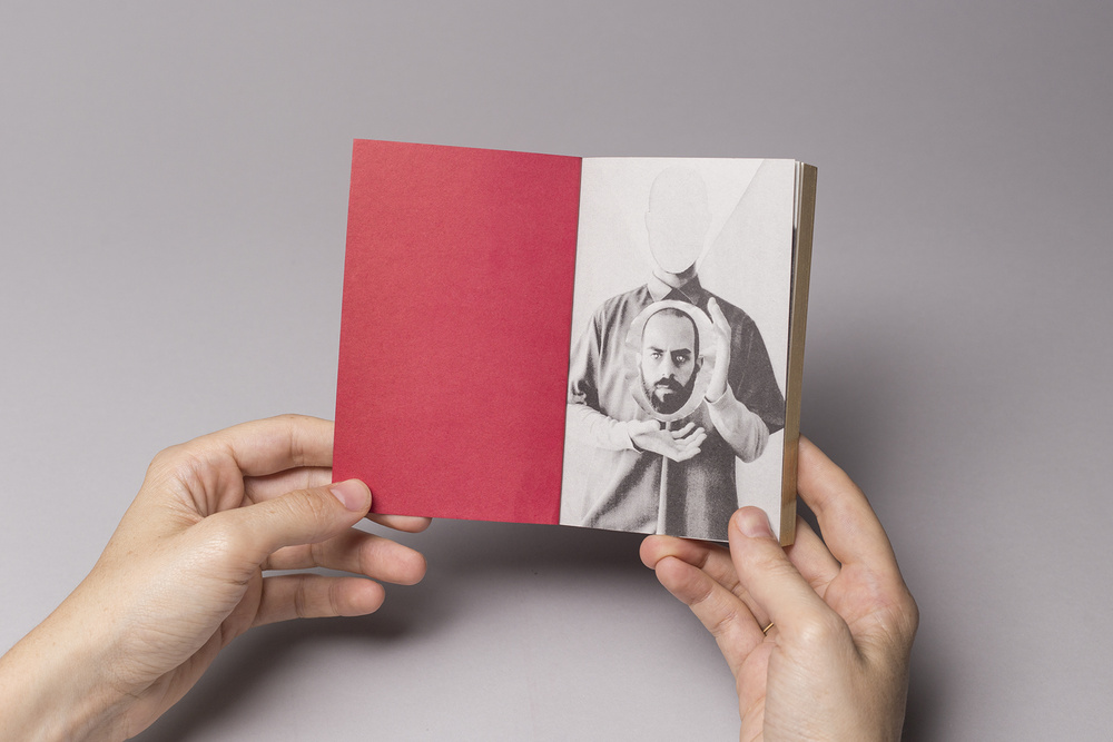 • Livro aberto com contracapa vermelha e página interior com fotografia em preto e branco de homem e figura sem rosto.