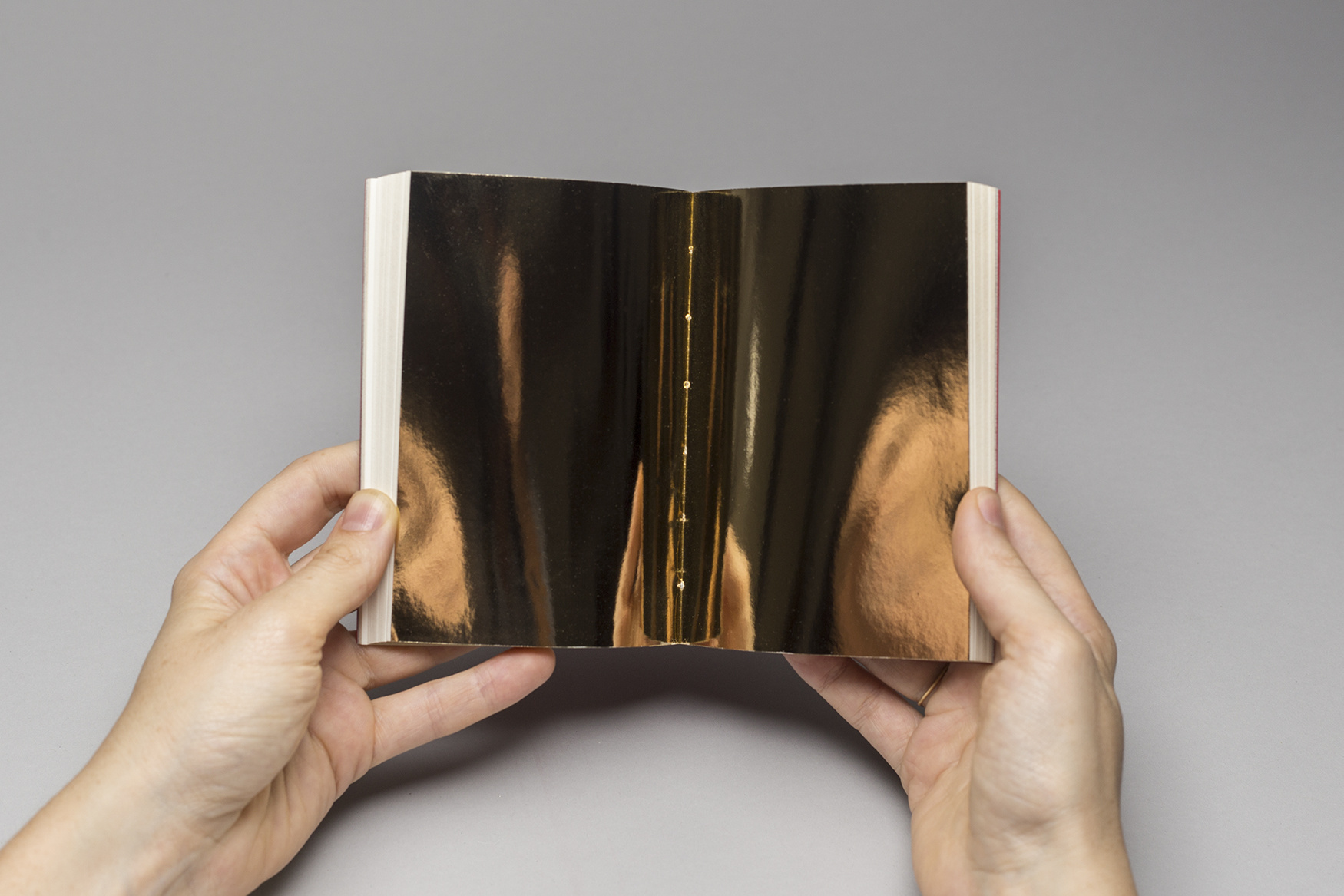 • Mão segurando livro aberto com página branca e página metálica dourada sobre fundo cinzento