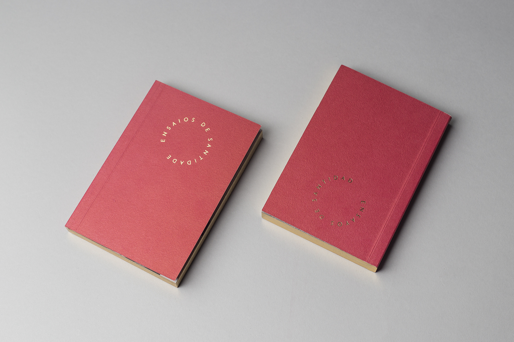 • Dois cadernos vermelhos com texto circular na capa sobre fundo cinzento