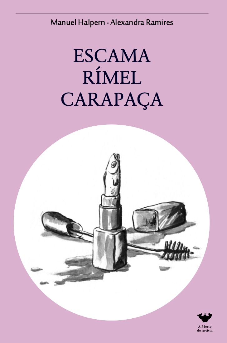 • Capa de livro com título Escama Rímel Carapaça e ilustração de batom e máscara de pestanas.
