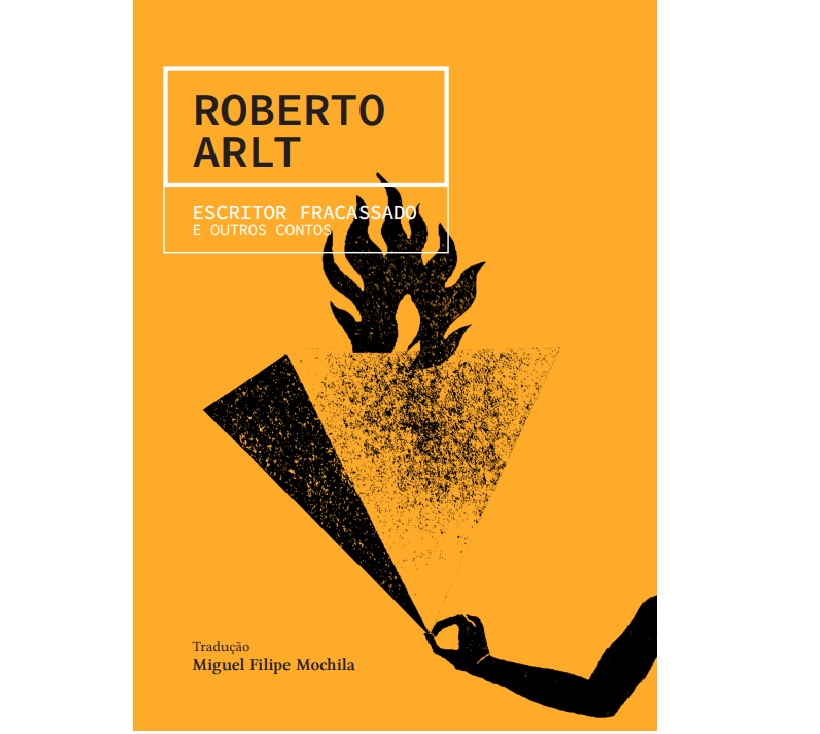 • Capa de livro laranja com nome do autor e título, ilustração de mão segurando papel em chamas