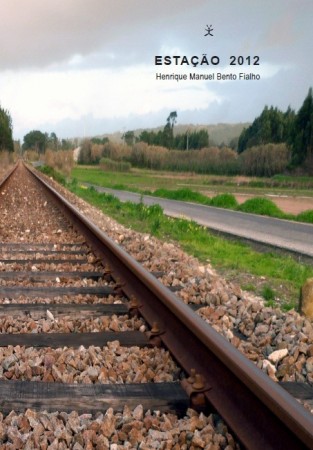 • Carril ferroviário com texto 'ESTAÇÃO 2012 Henrique Manuel Bento Fialho' no céu