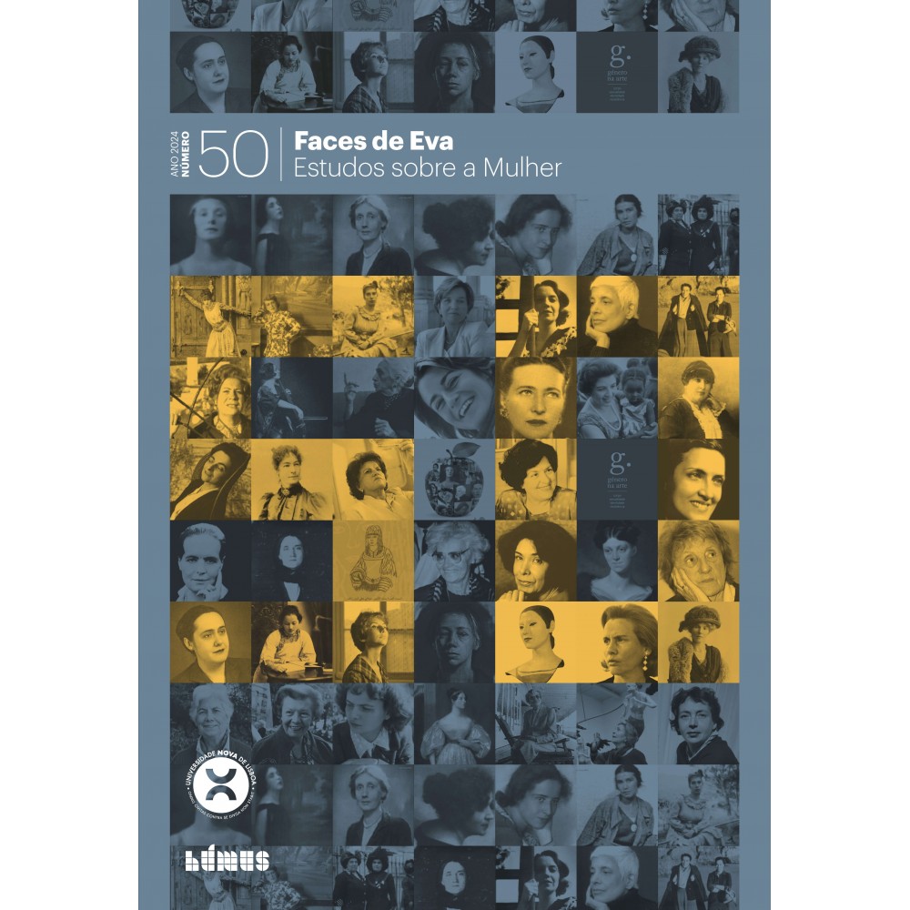 • Capa de livro com fotos a preto e amarelo de várias mulheres e texto 50 Faces de Eva
