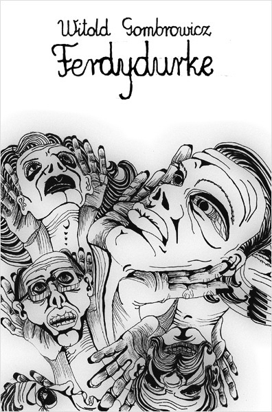 • Ilustração preta e branca com rostos humanos e texto Witold Gombrowicz Ferdydurke