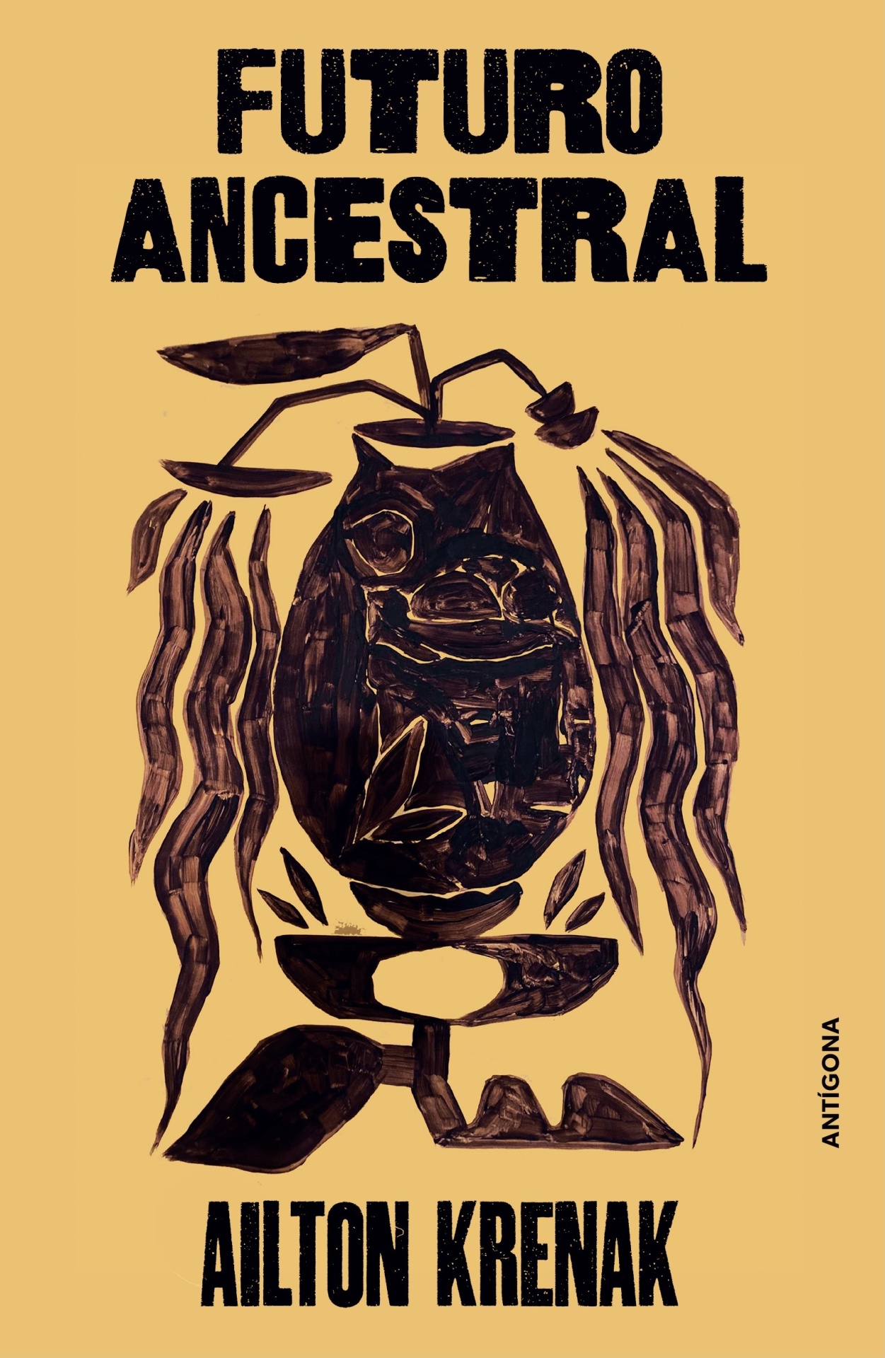 Capa de livro 'Futuro Ancestral' com ilustração abstrata em tons castanhos escuros e pretos sobre fundo amarelo