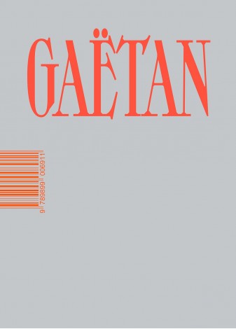 • Capa de livro cinza com título vermelho GAËTAN e código de barras laranja.